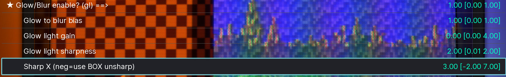 …but left “glow to blur bias” to 1.0 and in the same section, set sharp-x and sharp-y to 3.0: