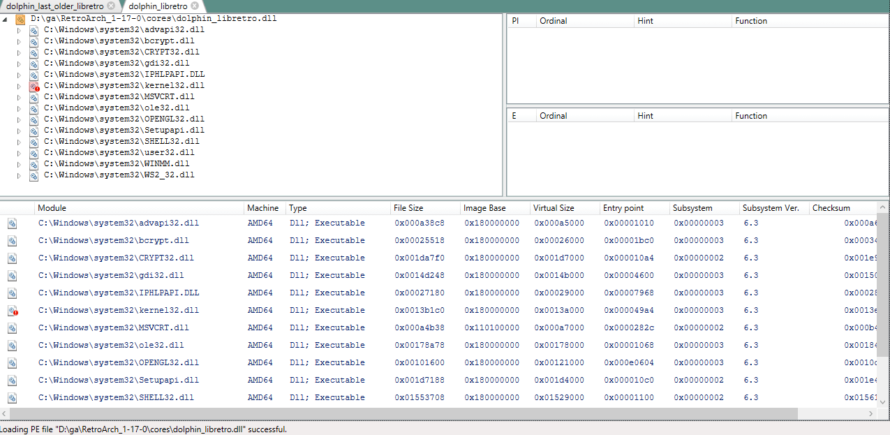 So, as you mentioned, the problem is related to “kernel32.dll”. This file is present on my machine (and it loads it fine with the old core as you can see). So basically, I’m guessing it’s expecting a different version of the dll (and I doubt it’s as simple as replacing that with a newer version…probably very ill-advised too and could possibly make one’s OS inoperable so I’m not even gonna attempt it).