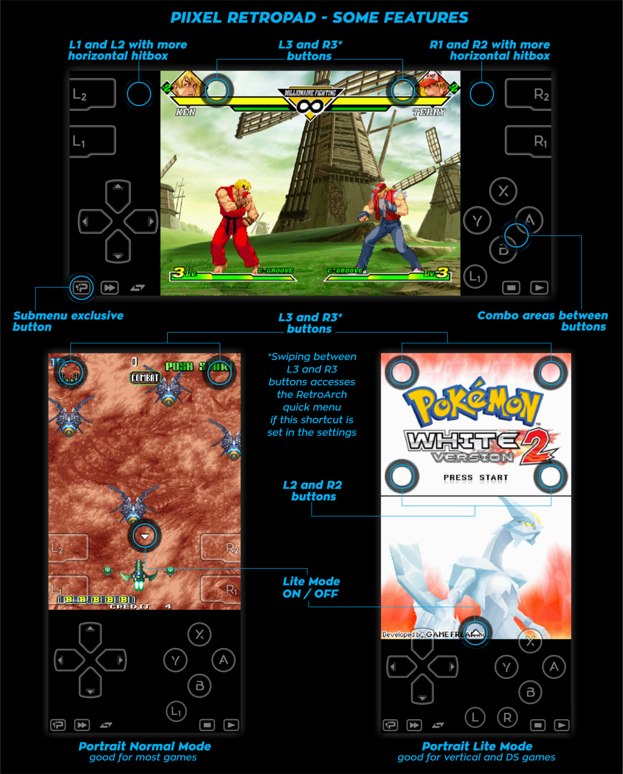 Hello, I’m here to present to you a gamepad overlay (input overlay) that I created for my personal use. I’ve been venturing into RetroArch in PC and Android for a long time (years and years) and although I find its concept incredible, gamepad overlays have never been a strong point of RetroArch (neo-retropad was a good evolution, but I’ve been here since the standard was the retropad, so believe me, it was more complicated). Because I like RetroArch and want to make my experience playing on a touchscreen more enjoyable, and in a way, more optimized for various consoles and game genres, I’ve been adjusting, improving and creating my own gamepad overlay for touchscreen. I think it can be useful for other people and I hope it can make your gameplay more enjoyable. So, I share it with you, PIIXEL RETROPAD.