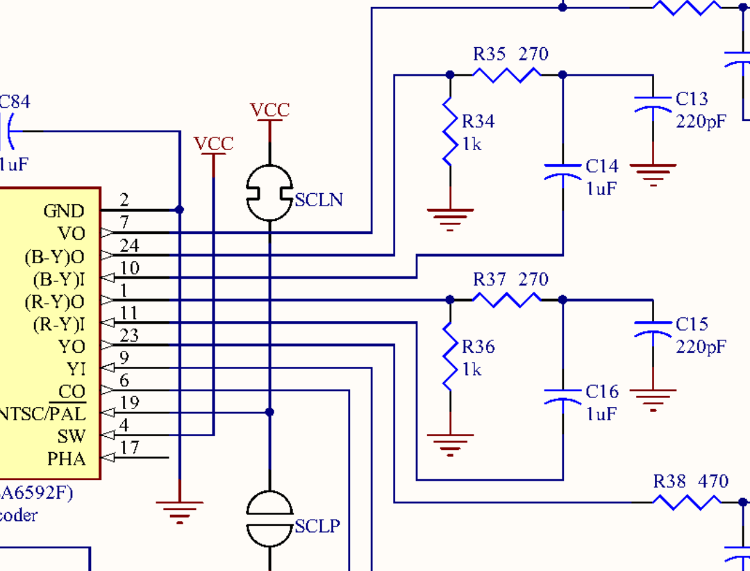 @beans I took a look at the Genesis schematic. The chroma filter is more narrow than the SNES, with a bandwidth of about 1.3 MHz. The bandstop looks like a pretty typical notch filter for NTSC video. Notice that the Genesis does not support S-Video while the SNES does. This is why the Gensis has a bandstop filter on its chroma path while the SNES does not. The low pass filters are also more narrow than the SNES, but still well beyond the horizontal resolution of SDTVs.