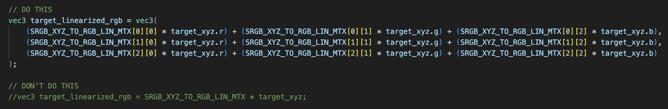 Yeah that was long before any color shaders that relies on color matrix and chromatic adaptions has existed, such as Colorimetry, Grade, and Chromaticity from the “misc” folder inside the shader folders. So we relied on just gamma corrected to linear, handling color matrix manually by modifying RGB individually.