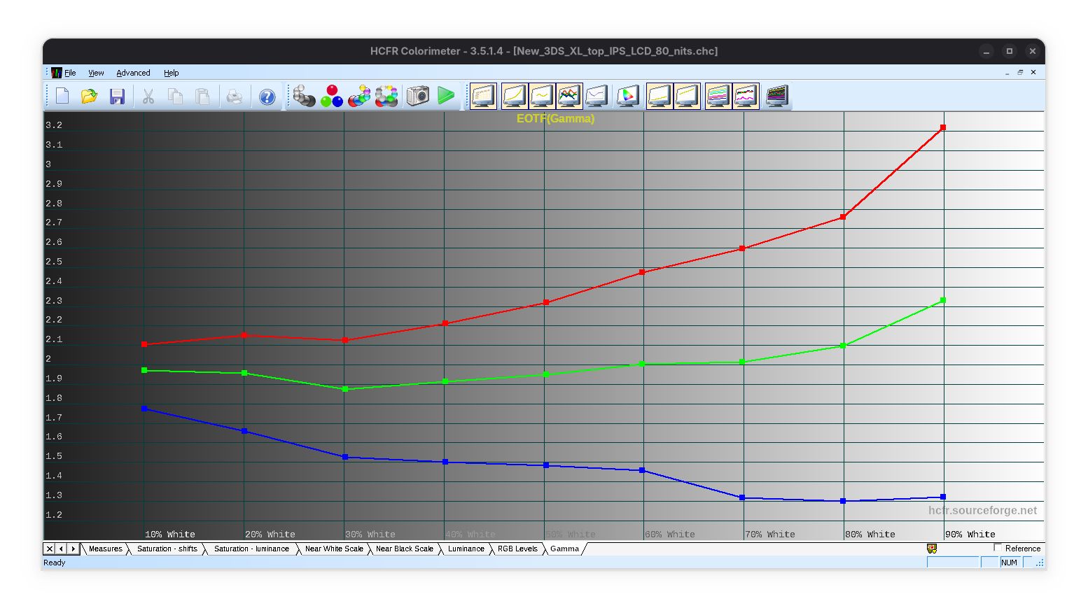 Sure. Once I get on, I’ll be sharing the data I got for GBA-SP-101, NDS Phat top and bottom, DS-Lite top and bottom, GB Micro, and the PSP 1000. As for GBC, GBA, and GBA-SP-001, they’re pretty much eyeballed on the colorspace with bunch of tools to use, and gamma seems closely identical to Pure Power Gamma, except just slightly darker on very dark swatches only. I did scan out the gamma, but I had to stabilize them in GIMP to see the best results since the colormunki photo had to scan at the very dark that has a slight noise variation to very dark luminance, and same with GBC. So I only have CHC data for any screens covered here that are emitted rather than refletive. As for the Switch OLED, it already has its HCFR data shown from a video I shared here last year or two.