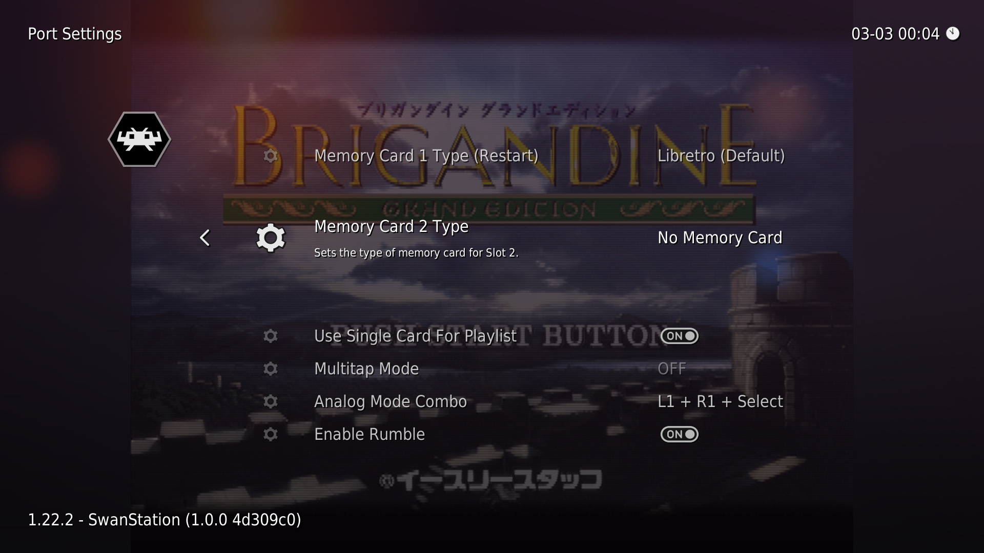 I had no clue that by adding a second memory card, which was needed for completion with this game (Brigandine: Grand Edition) it would destroy the first memory card by replacing it with a blank one. This is very strange behavior since I only opted to insert a second memory card, there goes my campaigns, I never had this issue with any other emulator before, so I’m just warning others to not do the same, and if you do, insert the second memory card right before starting your game, and probably making backups of the “saves” folder is a good idea.
