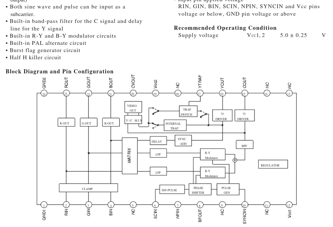 If you look the diagram looks like raw RGB passes the YIQ matrix and comes back to pins 9,10,11 as Y,I,Q to be further processed, add phase etc :wink: