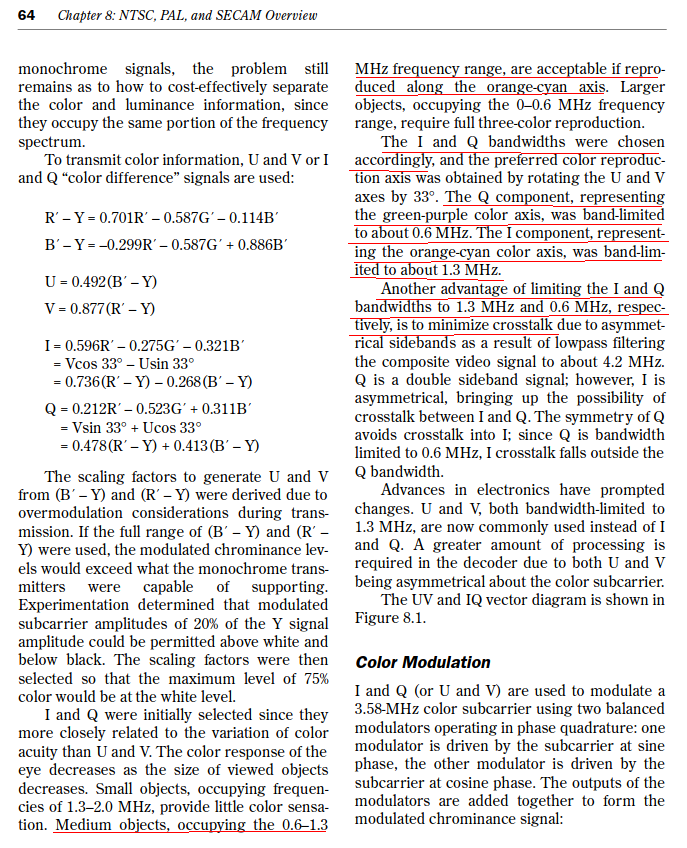 Did anyone read the document i posted with NTSC bandwidth standard, that if you make them equal you’ll introduce hell of a lot of crosstalk between I and Q? And PAL U/V needs extra work on decoder side to get rid of the crosstalk because they are equal?