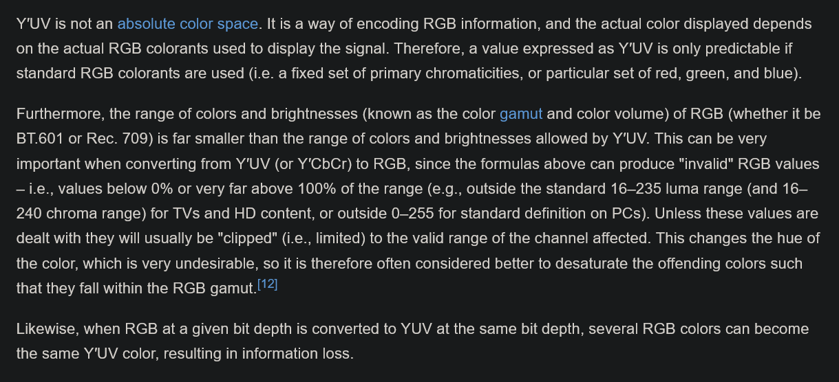 That tracks - the stuff we’re describing should all be happening on the TV side of things. The issue is not the signal itself, but how it’s being physically transmitted via a single cable. There’s no desaturation resulting from intentionally limiting I and Q during encoding?